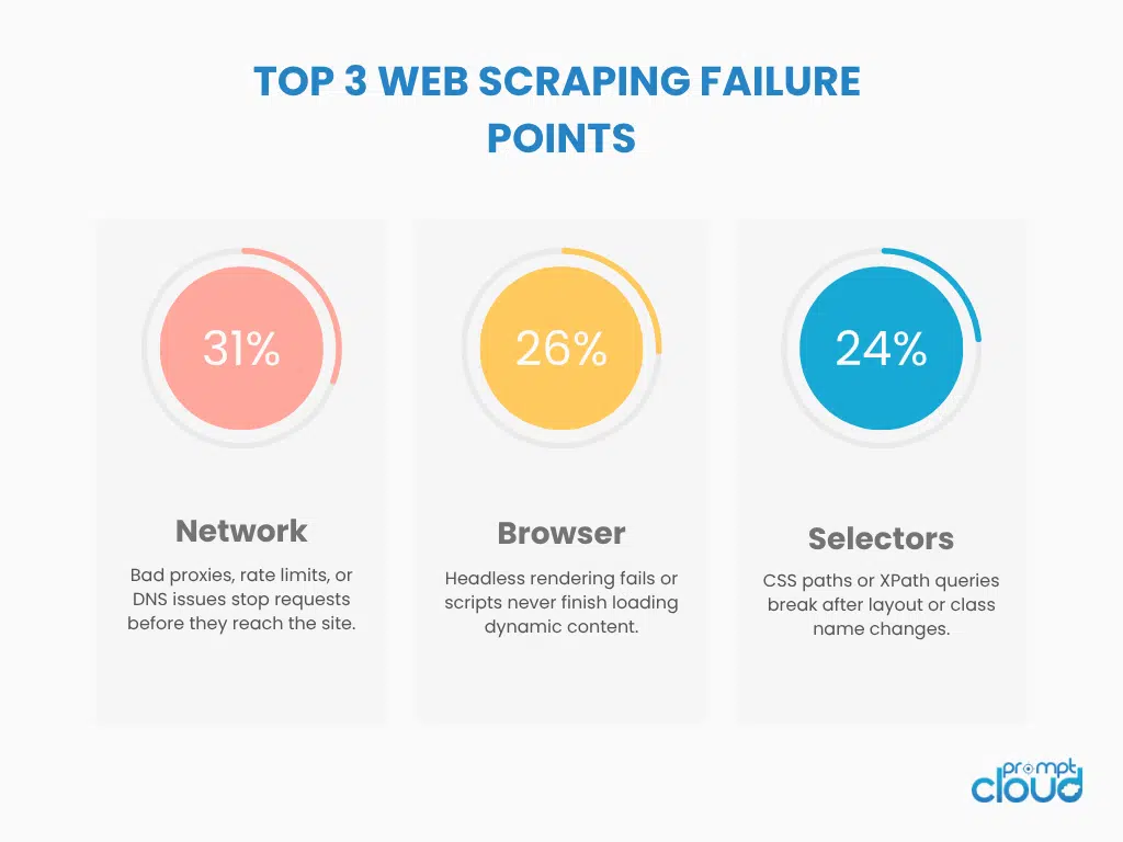 Every web scraping failure fits into one of five layers. The trick is isolating which layer broke before you touch code. Fixing a parsing issue won’t help if your network requests are never completed, and patching a selector doesn’t solve a CAPTCHA block.