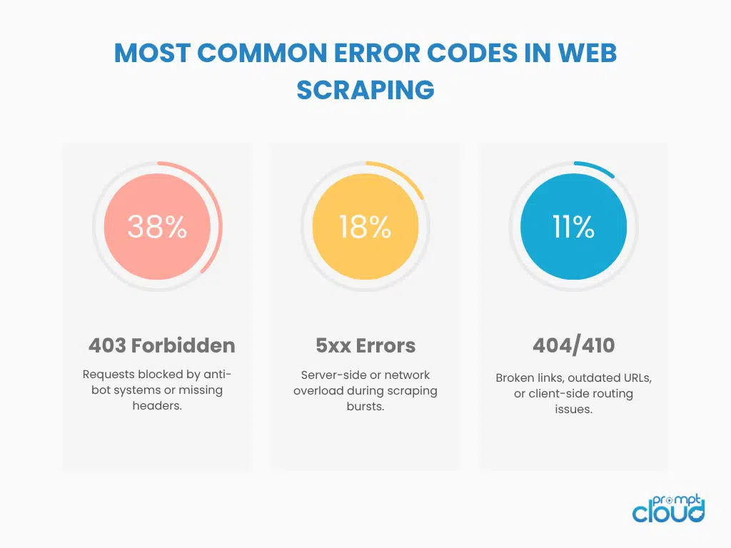 | 429 Too Many Requests | Spikes during bursts, clears if you wait | Rate limit per IP, per session, or per path | Reduce concurrency by 50% and try again | Backoff with jitter, per-domain concurrency caps, queue throttling, alternate paths or time windows |